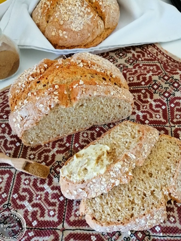 Двата вида брашно пресях и от тях отделих 1 каф.ч. за омесването. Сложих брашното в купа и добавих овесените ядки, содата, бакпулвера и солта. Разбърках добре и направих кладенче. В него сложих леко разбърканото яйце и айряна, и смесих добре. Плота, на който ще омеся тестото поръсих с брашно и изсипах сместа. Замесих меко тесто, използвайки отделената 1 каф.ч. брашно и още, ако е нужно, за да се оформи хем меко, хем нелепнещо тесто. Голямата тава на фурната покрих с хартия за печене и намазах леко с масло. От тестото оформих две питки, които овалях от двете страни в овесени ядки и разположих в тавата. С остър нож направих лек прорез под формата на кръст. Пекох в предварително загрята на 180 градуса фурна около 40 минути или до суха клечка, забодена по средата. Оставих да се охладят. Съхранявах увити в памучна кърпа.