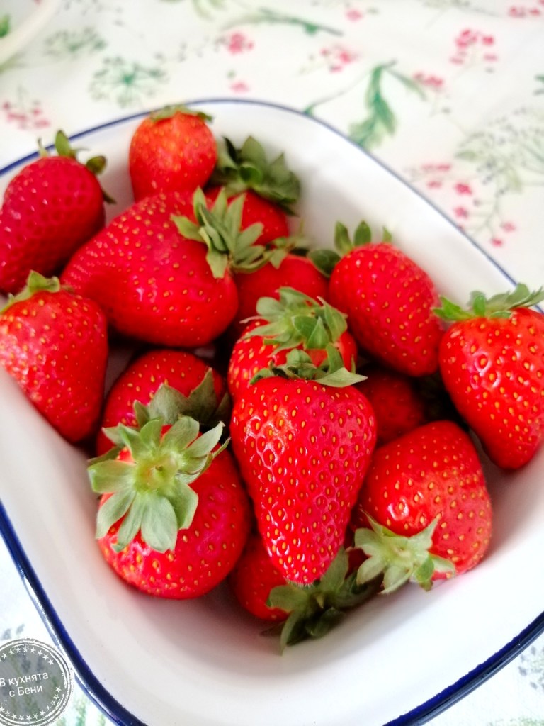 На сутринта почистих и измих ягодите. Нарязах ги на малки парченца и сложих в купичка с 1 с.л. пудра захар. Оставих ги в хладилника за около 15 минути, за да си пуснат сока.