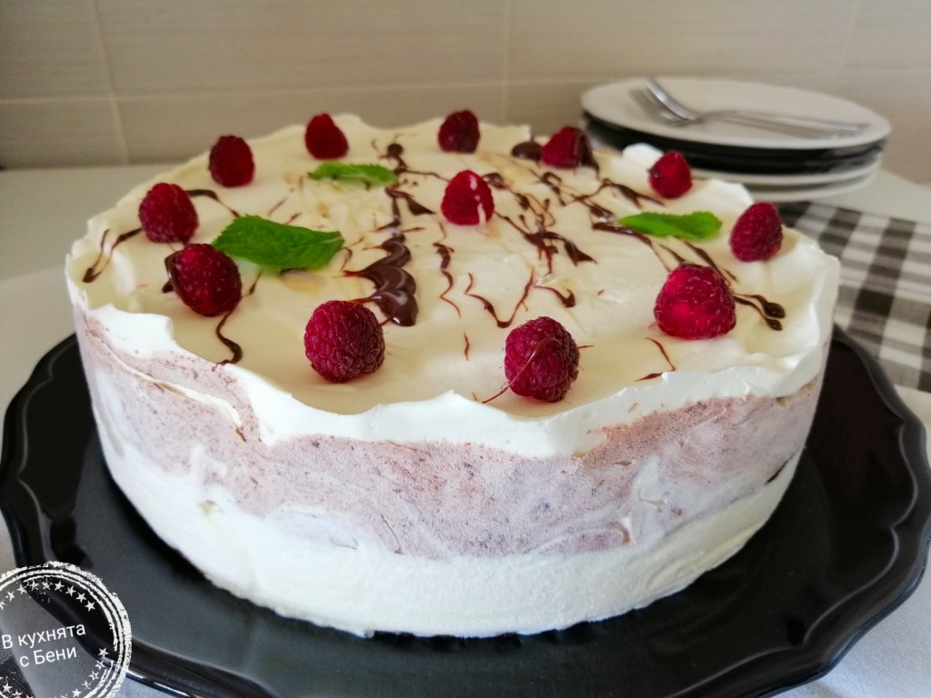 Преди сервиране махнах хартията и прехвърлих върху чиния за сервиране. Декорирах с малини и шоколадов сос приготвен от 40 гр. разтопен на водна баня натурален шоколад, смесен с 3 с.л. сладко кондензирано мляко. Разбира се може да украсите по ваш вкус и фантазия!