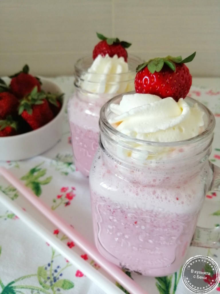 Ягодите почистих, измих и нарязах на парченца. Сложих ги в купа и поръсих със захарта. Разбърках и оставих в хладилника, за да си пуснах сока. Аз направих това от вечерта, но и 30 минути са достатъчни. В дълбока купа с улей сложих ягодите заедно със сока им и добавих млякото. Пасирах до гладка смес и насипах в чашите. Отделно разбих течната сметана, като към края добавих 1 ч.л. пудра захар. Шприцовах я върху напитката и украсих с ягода. Шейкът се сервира студен. В този случай всички продукти бяха студени и не се наложи допълнително охлаждане.