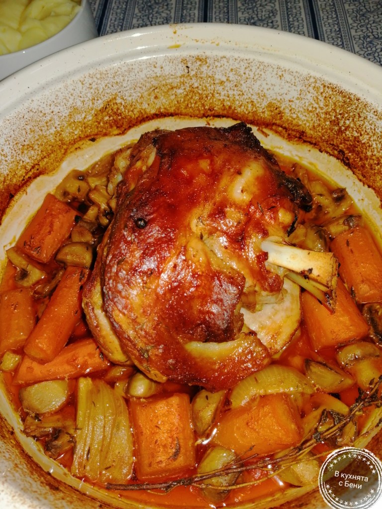 Джолана измих и подсуших. Шпиковах го, като в малки разрези сложих парченца чесън. Разположих месото в керамичен съд, намазан с олио. Около него разпределих гъбите, морковите и двете глави лук, разрязани на половинки. Тъй като ми останаха няколко парченца чесън и тях сложих при зеленчуците. Посолих леко и поръсих със сухия бульон. Добавих червения пипер, зърната микс пипери и клонките мащерка. Разбърках леко, като добавих още малко олио, за да се разпределят равномерно подправките. Залях с 1и1/2 ч.ч. гореща вода. На няколко места сложих парченца масло, похлупих с капака и пекох за 2и1/2 часа на 200 градуса. Съда сложих в студена фурна, защото така е препоръчително. На първия час внимателно махнах капака и обърнах джолана. За готовността на ястието се съди по това, месото лесно да се отделя от кокала и да има видимо готов вид. Последните 5 минути от готвенето, оставих да се пече без капак, за да се получи окончателния приятен загар на месото.