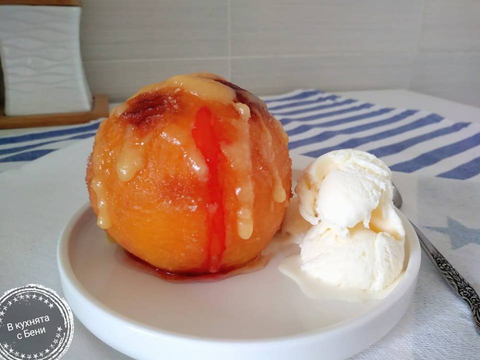 Пекох около 20 минути на 180 градуса или до апетитна коричка. Докато ги оставих леко да се охладят, приготвих соса. В касерола загрях портокаловия сок и захарта и готвих на слаб огън около 10 мин. или докато започна да се сгъстява. Полях прасковите с топлия сос и поднесох със сладолед. Този десерт се сервира с вилица, нож и лъжица. Невероятна феерия от вкусове!!! 😋😍🤗🍑