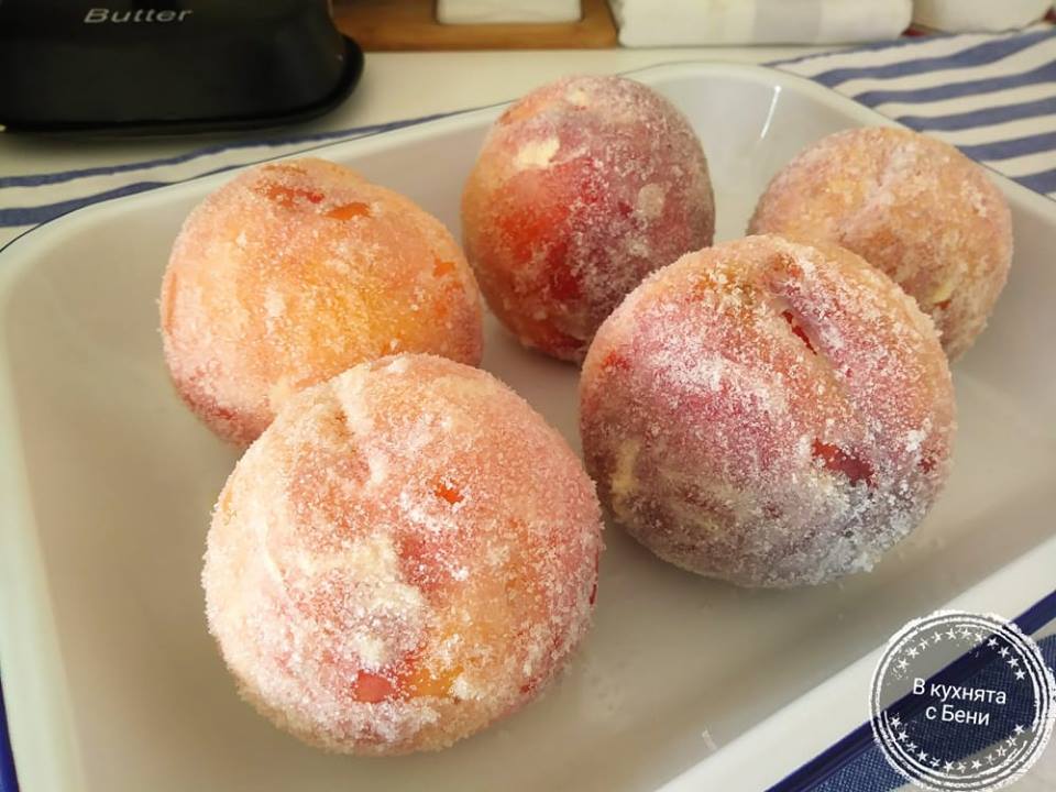 Прасковите измих добре. Подготвих си малка тава. Всяка праскова намазах обилно с меко масло. След това ги овалях в захар и ги подредих в тавата.