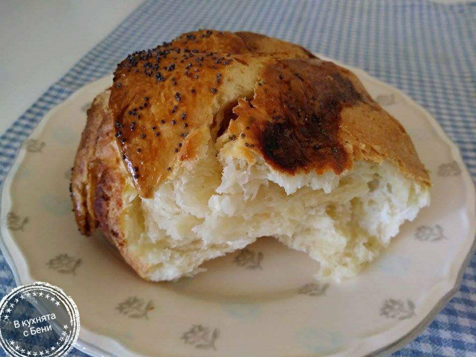 В затопленото мляко сложих маята, разбърках и оставих до пълното и разтваряне. Брашното пресях и сложих в дълбока купа. Добавих солта, захарта и мекото масло, и разбърках докато маслото се усвои. Направих кладенче и сипах леко разбърканите жълтъци и маята. Разбърках добре. Покрих със свежо фолио и прибрах в хладилника за през нощта. На сутринта извадих купата и оставих на топло да се отпусне. Разделих тестото на две равни части и разточих всяка от тях върху намаслен плот на тънък правоъгълник. Смесих натрошеното сирене с 3 белтъка и разпределих равномерно първо върху едната, а после и върху втората кора. Всяка от тях навих на фитил, усуках и двете заедно преплетох. Намазах с масло кексова форма с диаметър 25 см. и разположих тестото. Оставих на топло да втаса за около 30 мин. Намазах с жълтъка, към който добавих няколко капки мляко и поръсих с мак. Пекох в предварително затоплена на 170 гр. фурна. около 45 мин. При мен по-бързо се получи златиста коричка и затова покрих с хартия, за да се допече без да прегори. Дали е изпечена проверявам с дървено шишче и почукване. Ако „бие на кухо“ и по клечката не остава тесто, значи е готова. Изчаках да поизстине във формата и извадих върху метална решетка. Нямаше повече време да изстива, тъй като беше нападната от гладните.