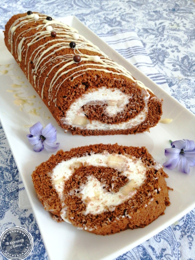Фурната загрях на 150 градуса. Тавата на самата фурна покрих с два пласта хартия за печене. Намазах леко с масло и изсипах сместа. Разпределих равномерно и загладих. Пекох около 13 минути или до суха клечка. Подготвих си голяма памучна кърпа, която навлажних добре. Готовия блат сложих върху нея и навих заедно с хартията на стегнато руло. Оставих да се охлади добре. През това време приготвих крема, като в купа разбих течната сметана и към края добавих 2 с.л. от предвидената захар. Когато бе готова, добавих крема сиренето и останалата захар и разбърках до хомогенизиране. Тук е моментът да опитате сладостта и да коригирате. Банана нарязах на дребни кубчета. Подготвих си голям лист свежо фолио. Внимателно развих блата и покрих с фолиото. С ловко и бързо движение обърнах блата, за да легне на фолиото. Внимателно премахнах хартията и намазах с крема. Подредих парченцата банан и завих отново на стегнато руло, разбира се без да захващам фолиото. Ако има нужда отрязваме още едно парче, за да го увием по-добре. Оставих в хладилника за поне 2 часа, но може и повече. Преди сервиране го аранжирах с разтопен на водна баня бял шоколад.