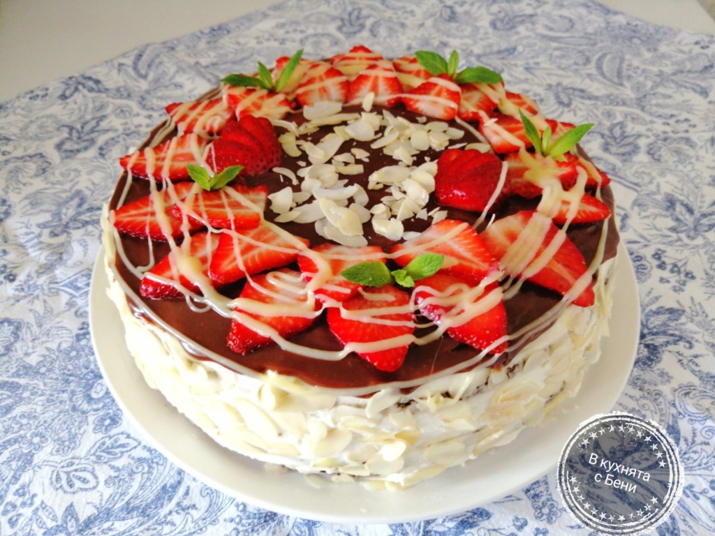 За блата пресях брашното със содата и бакпулвера. Сложих го в дълбока купа и добавих останалите сухи съставки-солта, ванилията, двата вида захар и какаото. Разбърках добре. В отделен съд разбърках айряна с яйцата и олиото. Не съм използвала миксер. Течната смес изсипах при сухата и разбърках. На финал добавих горещото кафе. Разбърках добре и така сместа за блата бе готова. Тя е доста по-течна от обичайното кексово тесто, но това не бива да ви притеснява. Блатът ще стане много сочен. Разделих сместа в три еднакви по големина купи. Покрих дъното на тортената форма /с диаметър 25 см./ с хартия за печене, сложих и стегнах ринга и изрязах излишните краища отвън. Леко намазах с масло хартията и стените на формата. Изсипах сместа от едната купа, разпределих го равномерно и пекох в загрята на 170 гр. фурна около 10-15 мин. или до суха клечка. Блата внимателно освободих от ринга и оставих да се охлади на решетка. Повторих процедурата и с останалите два блата. Докато се охлаждаха, приготвих крема. В купа разбих на пухкав крем течната сметана, като към края добавих 3 с.л. пудра захар. Отделно разбърках с миксер маскарпонето, крема сиренето и останалата захар до хомогенна смес. Добавих ги към сметаната, разбърках и така кремът бе готов. Ако има нужда от добавяте на още захар, сега е моментът. В чинията за сервиране сложих първия блат и го намазах добре с крем. Разпределих част от отцедените от сиропа им ягоди. Сложих втория, притиснах леко, намазах с крем и сложих още ягоди. Покрих с третия блат и намазах тортата отгоре, и отстрани. Прибрах за една нощ в хладилника. На сутринта приготвих глазурата. На водна баня разтопих шоколада, начупен на парченца, млякото и маслото. Разбърках докато се разтопи, хомогенизира и превърне в гладка и лъскава глазура. Охладих я леко. Изсипах я в центъра на тортата и я разнесох по повърхността. Аранжирах с ягоди и разтопен бял шоколад. Разтопих го по същата технология като глазурата. На водна баня смесих шоколада, млякото и маслото.