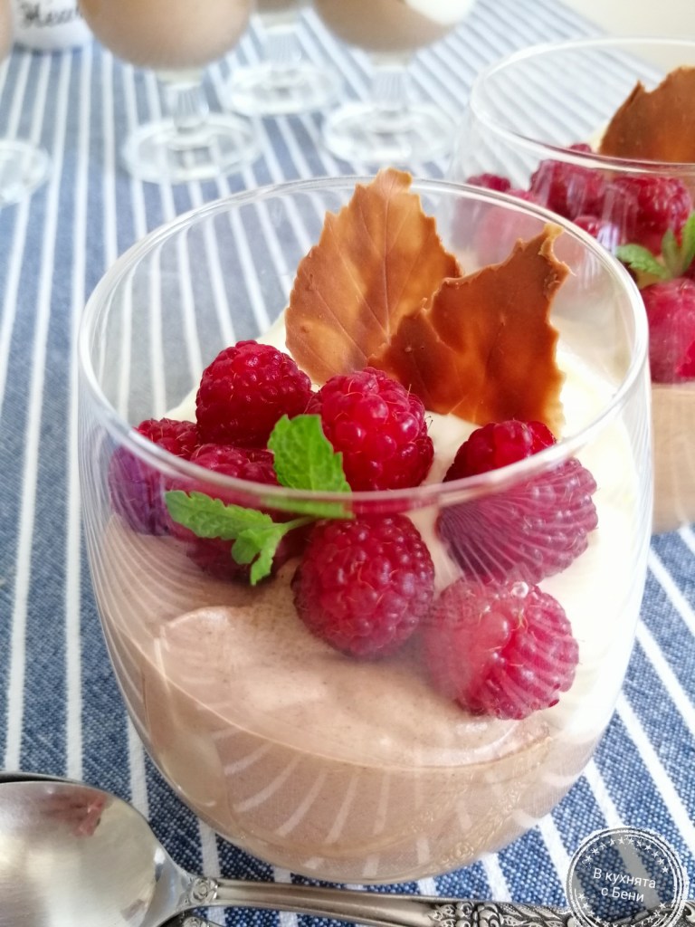Тъй като реших муса да бъде двуцветен, разделих по равно съставките. За всеки от двата муса предвидих 500 мл. сметана. В две касероли налях по 100 мл. от сметаната. Загрях първо едната и когато завря, я отстраних от котлона и сложих начупените парченца бял шоколад. По същия начин загрях и втората сметана, и когато завря, добавих парченцата натурален шоколад. Всяка смес разбърках до разтопяване на шоколада и хомогенизирането и. Оставих ги да се охладят напълно. Подготвих чашите, в които ще разпределя крема. В дълбока купа сложих останалите 400 мл. от количеството сметана за единия мус и започнах да разбивам с миксер. Почти на финал добавих 3 с.л. пудра захар и разбих до гъст крем. Не трябва да се прекалява с разбиването, защото има риск да се втечни изведнъж. Щом си вижда, че сместа е гъста и оставят бразди от бъркалките на миксера, значи е готова. Към така разбитата сметана на тънка струйка, при непрекъснато разбъркване с шпатула, добавих изстиналия тъмен шоколад. Когато сместа стана едноцветна я разпределих в чашите, като ги държах под наклон и се старах да слагам само от едната страна. След това ги подпрях с едни други чаши, за да стоят под наклон. Когато разпределих крема във всички чаши, приготвих и белия. По същия начин в напълно суха купа сложих добре изстудената сметана /останалите 400 мл./ и разбих с миксер, като към края добавих 2 с.л. пудра захар. Към пухкавата и гъста сметана, на тънка струйка прибавих сместа с белия шоколад. Разбърках с шпатула и насипах в чашите, като се старах кремът да попада в празната им част. Така напълнените чаши прибрах в хладилника за през нощта. Ако не разполагате с толкова време е добре поне 3 часа да постоят на студено.