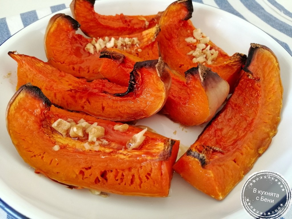 Използвах тиква „Цигулка“. Измих я и нарязах на парчета. Тавата покрих с хартия за печене, с идеята за по-лесното и измиване след това. Подредих тиквата, поръсих с по малко захар, налях около 50 мл. вода и сложих в загрята на 180 градуса фурна. Пекох около час или до пълно омекване на тиквата. Важно е да добие маслена текстура. Готовата тиква поръсих със счукани орехи и полях с мед, което всъщност е по желание.