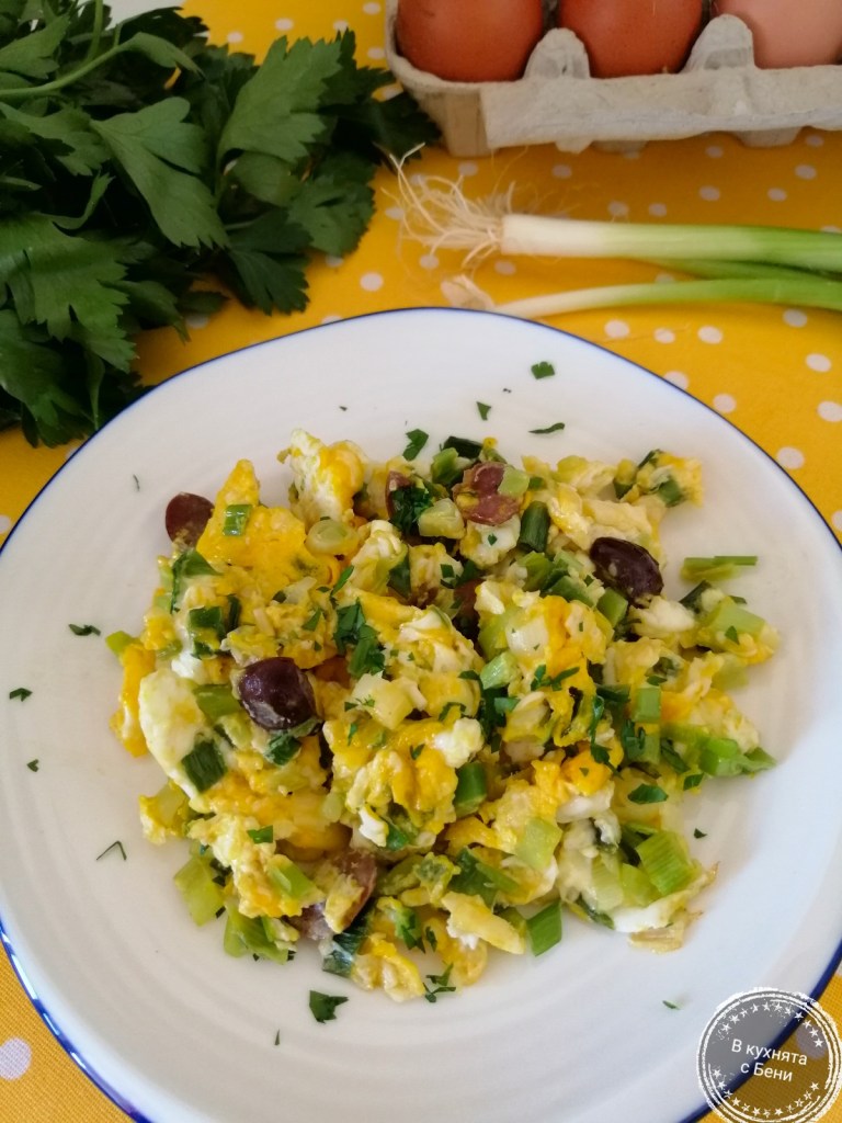В тиган с незалепващо покритие /моят е керамичен/ загрях масло и добавих ситно нарязания лук, като използвах и бялата му част, и перата. Посолих и готвих 2-3 минути или докато видимо започна да омеква. Тогава прибавих парченцата маслини, разбърках и след около 1 минута сложих яйцата. Посолих още малко и леко разбърках всички продукти. Готвих за кратко или докато яйцата се стегнаха. Сервирах ястието поръсено с малко ситно нарязан магданоз.