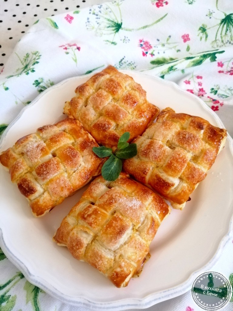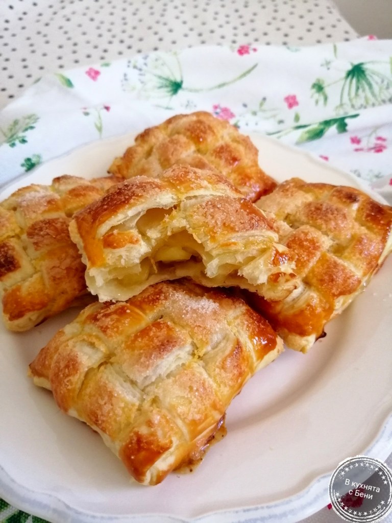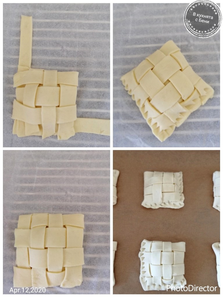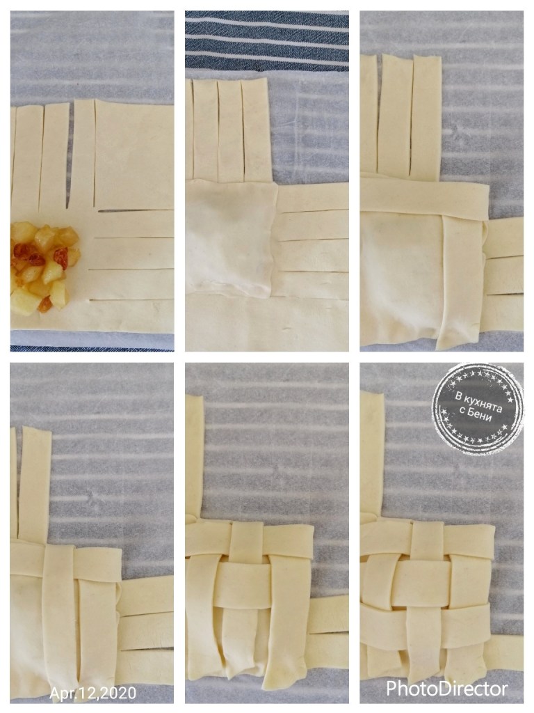 Фурната загрях на 190 градуса. Тавата на фурната покрих с хартия за печене. Тестото разтворих и измерих. Дълго бе 40 см. и широко 26 см. Разрязах го веднъж по дължина и три пъти по широчина. Така се получиха 6 квадрата с размер 13х13 см. Както съм показала на снимките, правя разрези. В единия край на всеки квадрат сложих от ябълките и няколко стафиди. Покрих го с квадрата, който е срещу него и започнах да правя плетката. Надявам се да се снимките да са от помощ. Готовите десерти запечатах добре, като притиснах двете отворени страни с острото на ножа. Прехвърлих ги в тавата, намазах с жълтъка и поръсих с по малко ситна захар. Сложих да се пекат в добре загрятата фурна за 15-20 минути или до видима готовност. Както не веднъж съм съветвала, по-добре е да препечем десертите от бутер тесто, отколкото да останат сурови и глетави. Оставих леко да се охладят и поднесох. Честно казано топъл десерта на мен ми хареса повече.