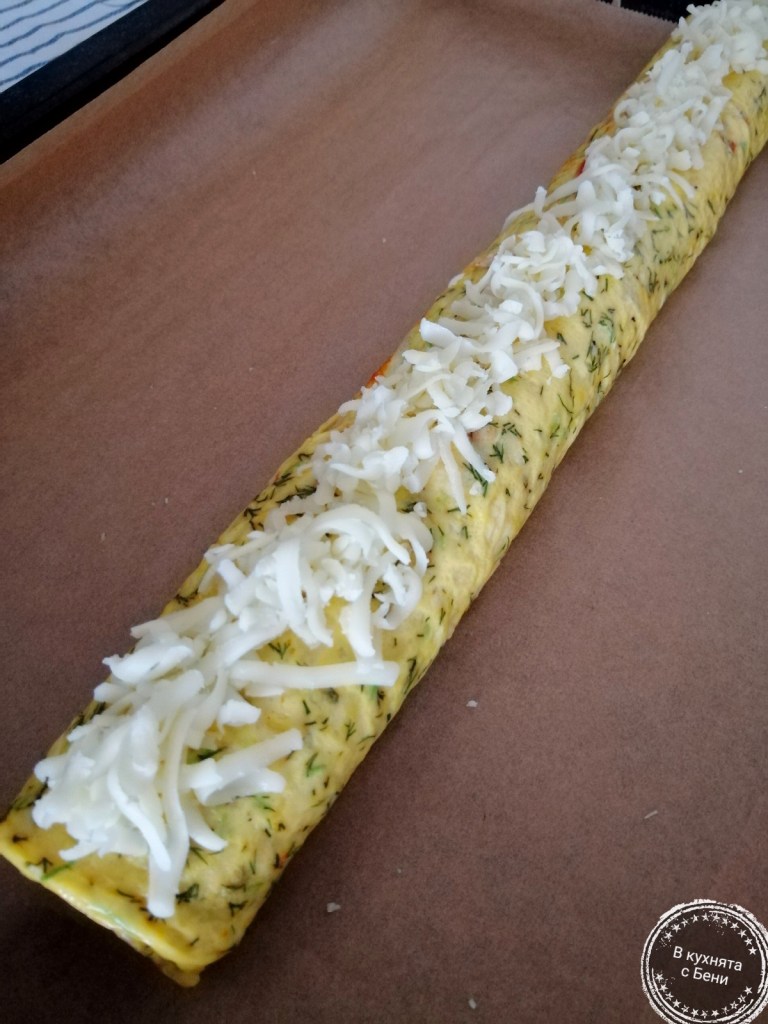 На работния плот си подготвих парче хартия за печене. Готовия яйчен блат обърнах върху така подготвената хартия и внимателно го освободих от тази, върху която бе изпечен. Намазах съвсем леко с лютеницата и поръсих равномерно с кашкавала. Внимателно навих на стегнато руло и прехвърлих в тавата, която покрих с още едно парче хартия. Отгоре сложих малко кашкавал и върнах във фурната да се допече за още 10-ина минути. Не целим да се образува запечена коричка!