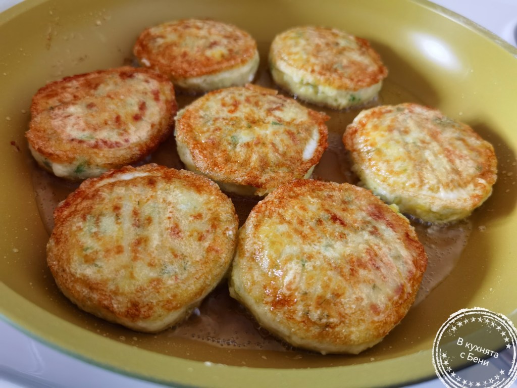 Когато всички бяха готови и подредени върху фолиото, в малка купичка разбърках белтъците с щипка сол. В тиган с керамично покритие сложих олио, което не покри цялото дъно. Котлона загрях на 4 от 6 степени на моята печка. С помощта на малка шпатула внимателно взимах кюфтетата и ги овалвах в белтъците, след което ги слагах да се пържат. На два пъти изпържих цялото количество. Щом бъдат сложени в тигана, не трябва да се докосват или побутват. Когато видимо добиха загар от долу, ги обръщах и пържих и от другата страна. Повторих това още веднъж, тоест обърнах ги общо по два пъти на страна. Готовите картофени кюфтета сложих в чиния, покрита с домакинска хартия, която да поеме евентуалната излишна мазнина.