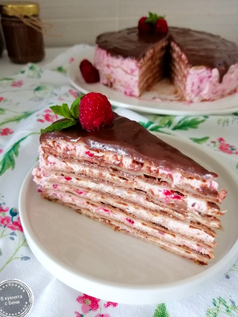 В подходяща чиния сложих малко от ганаша и върху него първата палачинка. Намазах я с розов крем и покрих с втора палачинка, която намазах леко с ганаш. Така процедирах, като редувах продуктите докато остана една палачинка. Преди да я поставя най-отгоре, измазах тортата от страни и отгоре с останалия розов крем. Тогава поставих последната палачинка и прибрах тортата в хладилника за през нощта.