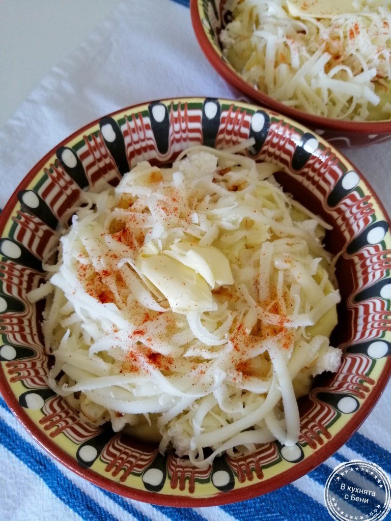 Керамични купички с диаметър 16 см. намазах с масло. Разпределих картофеното пюре и поръсих щедро с натрошеното сирене. Отгоре разположих лука и завърших с плътен ред настърган кашкавал. В средата сложих парченце масло и леко поръсих с червен пипер.