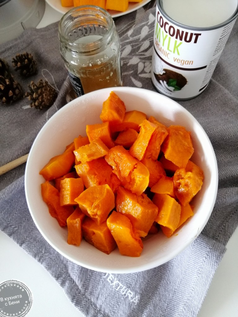 Често кокосовото мляко се разделя на гъста и водна част. В случая се използва и от двете, като на тиквата и е нужна течност, за да се получи гъстотата на муса. Също така меда може да замените с подсладител по ваше желание.