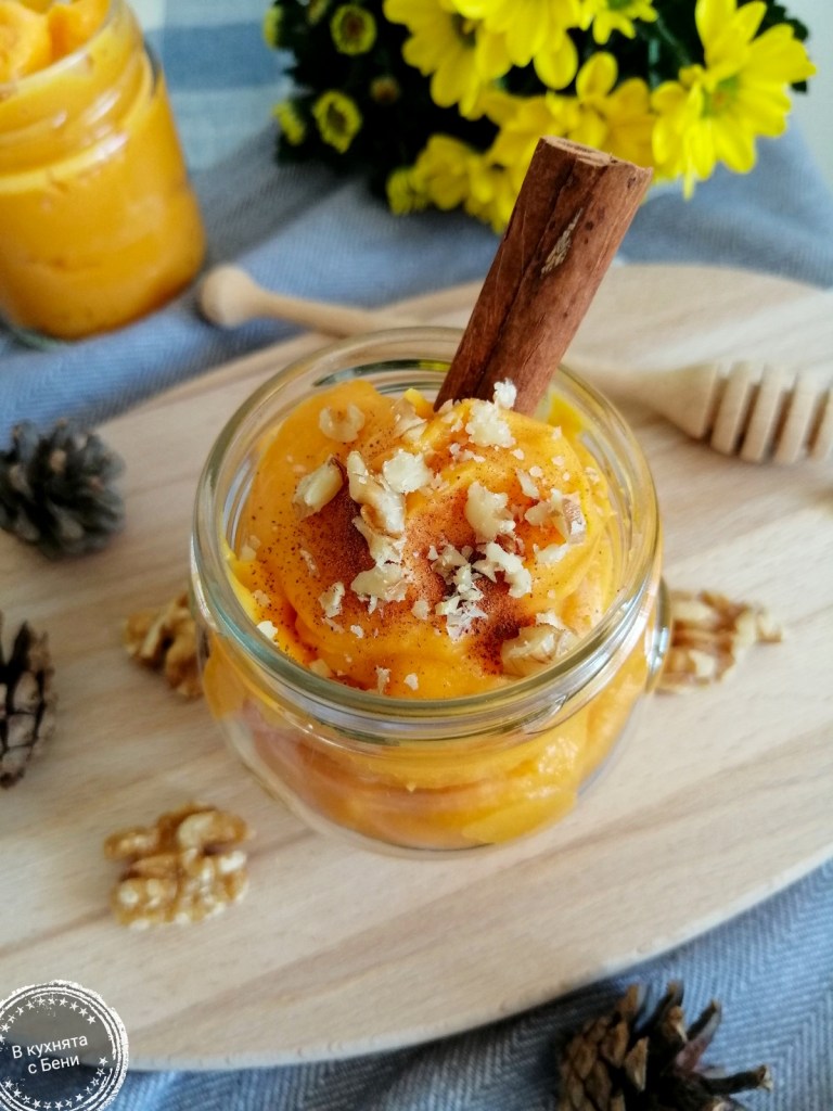 Муса от тиква разпределих в три бурканчета. Поднесох го поръсен леко с канела и нарязани орехови ядки.