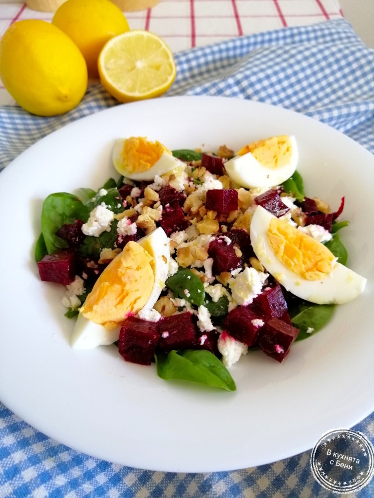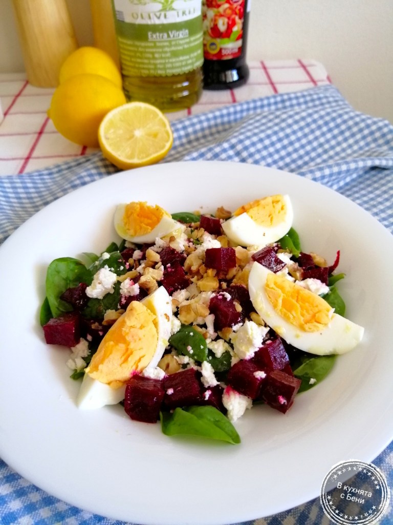 На дъното на чиния сложих повече от половината спанак, отгоре цвекло, натрошено сирене, отново листа спанак, останалото цвекло и сирене. Подредих яйцата, поръсих с леко запечените в сух тиган орехи и полях със зехтин.