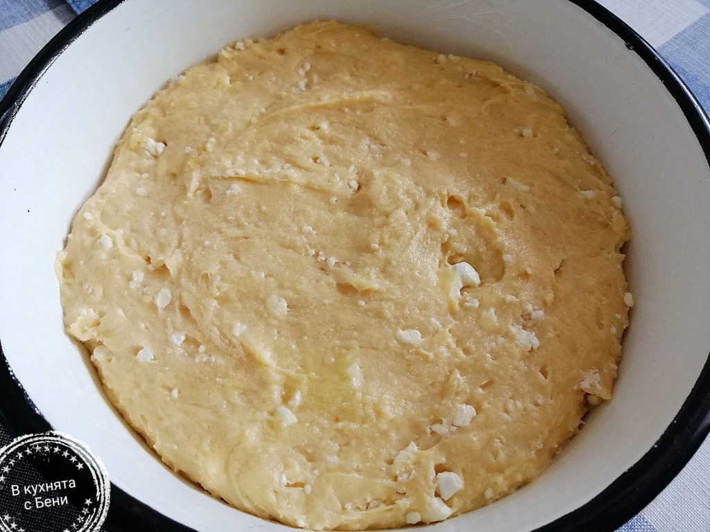 В купа изсипах така шупналата мая и добавих предварително разбърканите яйца, останалата захар, солта, маслото, олиото и сиренето. Разбърках с кухненска бъркалка и започнах да добавям пресятото брашно. Получи се лепкаво тесто, което не трябва да е твърде гъсто. Може да не се наложи да сложите цялото брашно. Покрих купата с парче фолио за свежо съхранение и оставих да си почине на топло за 30 минути. Тестото не увеличава обема си, както обичайно при работа с мая. След това го прехвърлих в добре намазана с масло тавичка, с диаметър 21 см. Оставих го да си почине за още 15 минути, след което го намазах с жълтък и поръсих със сусам и мак. Сложих да се пече в добре загрята на 170 градуса фурна за около 40 минути, или до видима готовност и суха клечка, прободена в средата на печивото.