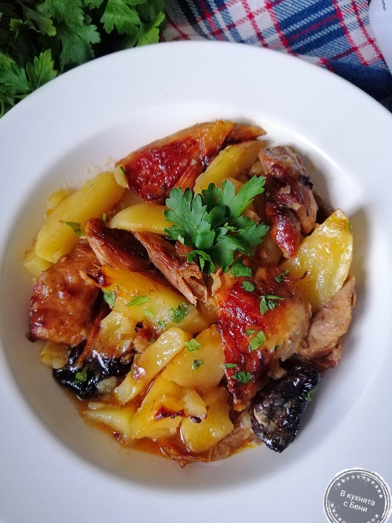 Картофите обелих и нарязах на полумесеци. Сложих ги в тава и леко посолих. В малък тиган с олио запържих втората глава лук, която нарязах на ситно. Когато доби приятен загар, добавих червения пипер, разбърках и веднага отстраних от котлона. Добавих малко от горещия бульон. Обезкостих джолана и го накъсах на едри парчета. Добавих го при картофите заедно с лука от тигана. Разпределих равномерно и залях с горещ бульон, който почти да покрива продуктите. Идеята е след сготвянето да остане малко сос. На няколко места сложих сините сливи, които бях накиснала в топла вода за около 15 минути. Пекох ястието около 45 минути, или до готовност на картофите и апетитен загар.