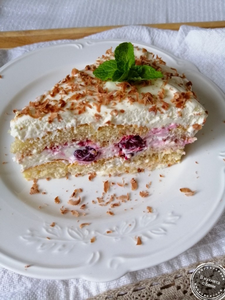 На дъното на кръгла форма с диаметър 25 см. и височина 5 см. сложих малко от крема. Отгоре подредих плътен ред от бишкоти, които потопих за 3-4 секунди в хладкото мляко. По-добре да останат една идея по-твърди, отколкото да се разкашкат в десерта. Те така или иначе ще доомекнат от влагата на крема. Върху тях сложих пласт от крема и разпределих вишневия сос. Използвах и малкото останала течност. След това подредих втори ред потопени в мляко бишкоти и завърших с крем. Прибрах десерта в хладилника за не по-малко от 4-5 часа. Преди сервиране го поръсих с настърган шоколад и отрязах първото парче. 🍒Всъщност в хладилната камера винаги имам пакет замразени вишни, защото дават много въможности за приложение.🍒Момчетата определиха вкуса на десерта като на сладолед 😋🍦Може да приготвите студения сладкиш и в отделни чаши.🍨