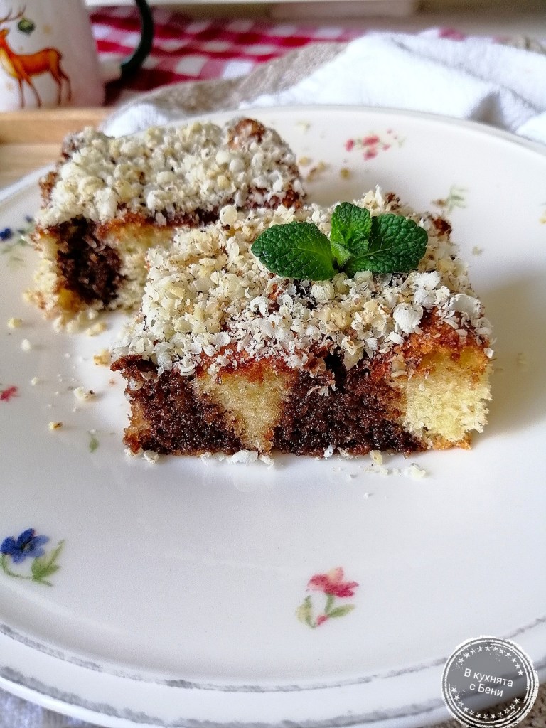 Вече изстиналия сладкиш набодох с тънък молив на доста места. В тях полях от соса, като със сигурност дупчиците няма как да се напълнят до горе. Поръсих готовия десерт със смлени орехи, които да прикрият отворите на дупчиците, а и да допълнят вкуса. Може вместо с орехи да поръсите с кокосови стърготини.