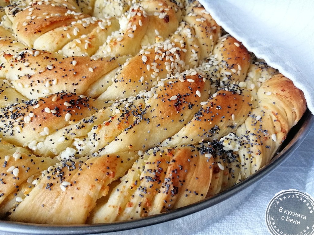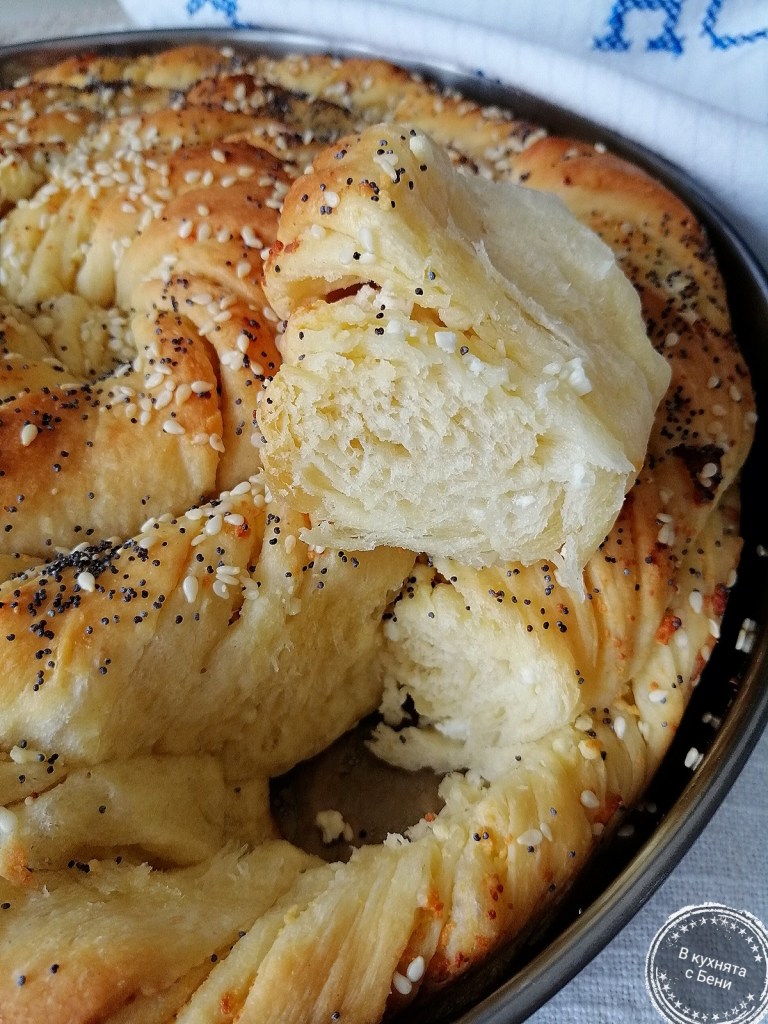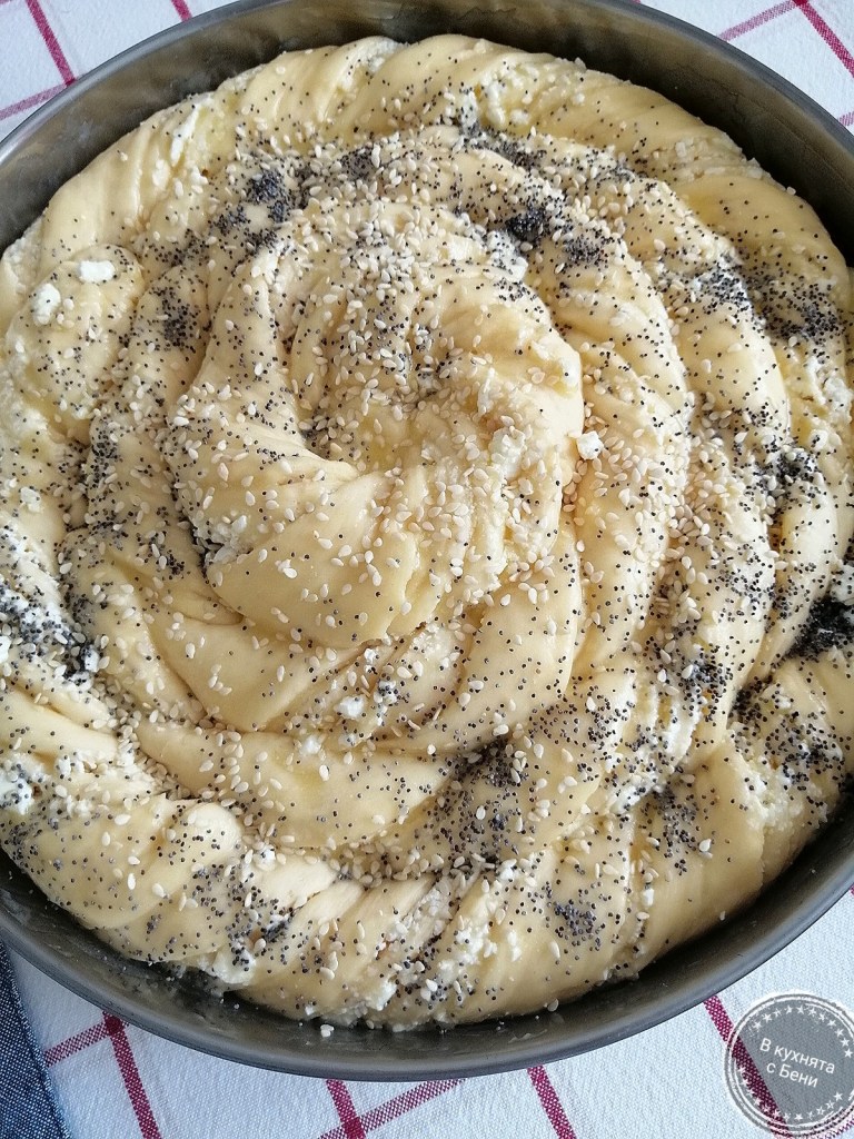 След 15 минути тестото се бе надигнало. Разрязах го на четири равни части. Всяка разточих с правоъгълна форма и прехвърлих малко по-нагоре на плота, за да мога да разточа удобно следващата. Намазах добре с масло и поръсих със сирене. Искам да уточня, че хич ме няма по прецизност на формите, но ми се струва, че не е фатално. 🙃 Разточих следващата кора и я поставих върху първата, като и нея намазах с масло и поръсих със сирене. Същата процедура направих и с третата кора, като четвъртата само поставих най-отгоре. Леко разточих и разрязах на пет ленти. Тава с диаметър 30 см. покрих с изрязано в кръгла форма парче хартия за печене. Намазах дъното и стените с масло. Всяка лента усуках и разположих в тавата, като започнах от центъра. Тавата покрих с парче фолио за свежо съхранение и оставих на топло да удвои обема си, което при мен отне 50 минути. Фурната загрях на 170 градуса. Намазах тутманика с останалото разтопено масло и го поръсих с мака и сусама. Тук е моментът да си призная, че забравих да го намажа с яй це, както бе посочено в рецептата, но и така се получи чудесно.