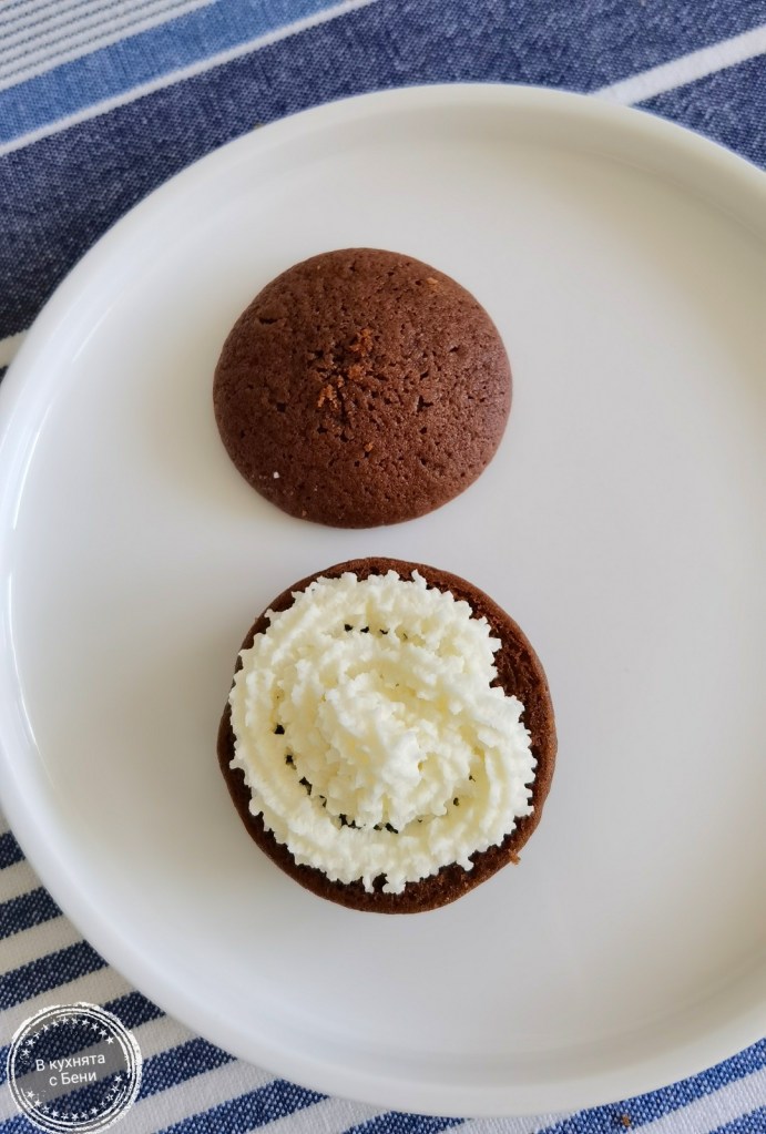 Готовите сладки извадих в чиния и шприцовах втора тава. Така процедирах, докато използвах цялото тесто. Получиха се 90 броя с диаметър около 5 см. /диаметър на вече изпечената половинка/.