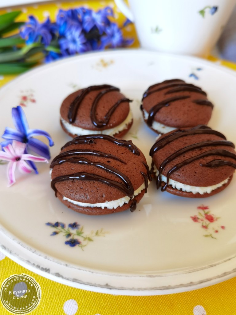 В купичка сложих мекото масло, ванилията и пудрата захар, и с миксер разбърках до гладка смес. Добавих маскарпонето и разбърках за кратко, само колкото да се смеси с останалите продукти. Шприц напълних с част от крема и шприцовах върху едната половинка сладка. Покрих с втората половинка, леко притиснах и готовата сладка сложих в чиния. По този начин приготвих всички. Получиха се 45 слепени сладки с диаметър 5 см. Прибрах ги в хладилника за 30 минути. През това време приготвях ганаша, като в купичка на водна баня сложих начупения шоколад, млякото и маслото. Загрях, докато се получи гладка и лъскава смес. Оставих леко да се охлади и украсих небрежно сладките. Тъй като еднократните ми пошове се изчерпаха, напълних обикновено найлоново пликче, направих съвсем малка дупчица и така украсих сладките.