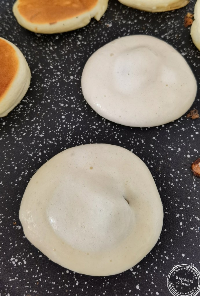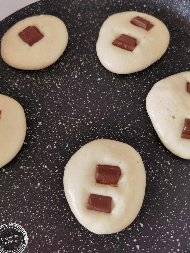 Котлона загрях на най-високата степен, след което го намалих на 4 от 6 на моята печка. Сложих тиган с незалепваща повърхност и когато се нагря добре, го намазах с олио. С лъжица изсипах по малко от сместа и сложих парченца шоколад. Веднага ги покрих с още малко смес. Когато видимо мини палачинките се стегнаха, ги обърнах и пекох и от другата страна до видима готовност. Не съм измервала нужното време за всяка страна, но с докосване може лесно да се провери. Палачинката трябва леко да пружинира, а да не е съвсем мека.