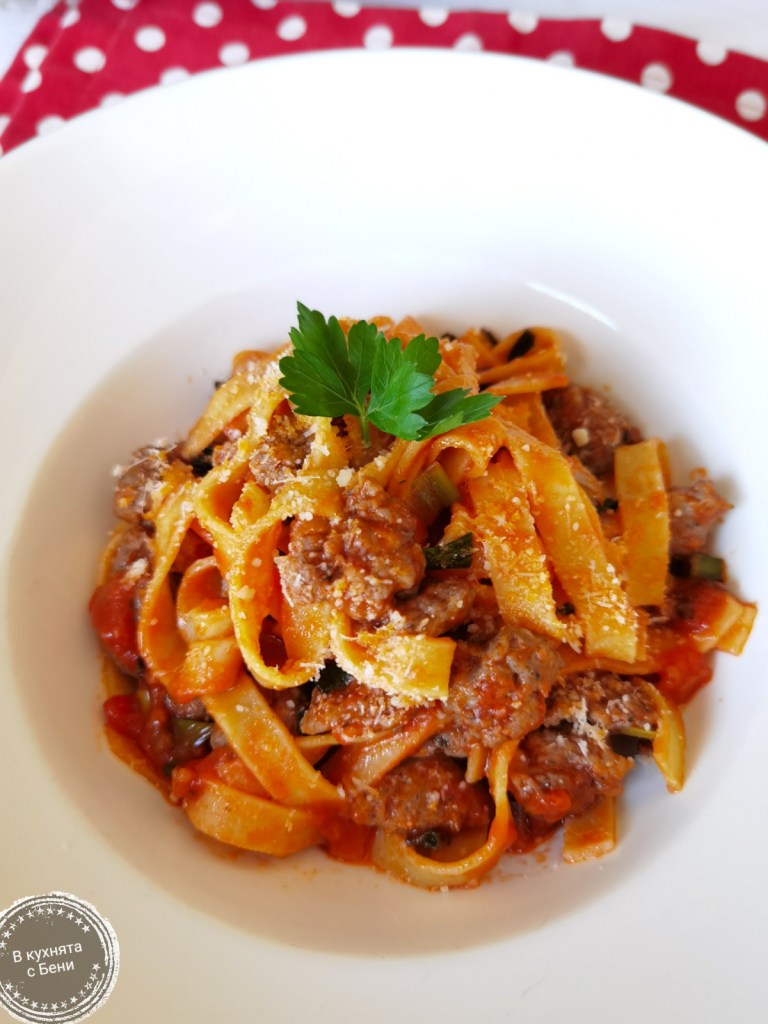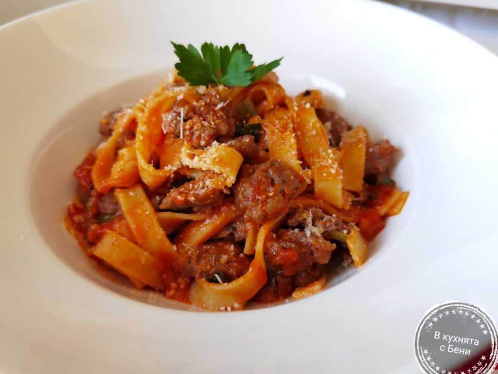 Включих два от големите котлона на печката ми. На единия сложих да заври тенджера с вода, малко сол и няколко капки олио. Във врящата вода сложих пастата и варих според указанието на опаковката. На другия котлон сложих голям и дълбок тиган с 3 с.л. олио. Когато мазнината се загря, сложих нарязания на дребно лук, леко посолих и добавих парченцата наденица. Готвих на средна степен на котлона, докато месцата се запържиха добре, след което добавих пресованите скилидки чесън. След по-малко от минута прибавих смлените домати и ригана. Щом сосът завря, добавих пастата и 3-4 с.л. от течността, в която са е варила. Готвих още 5 минути и ястието бе готово.