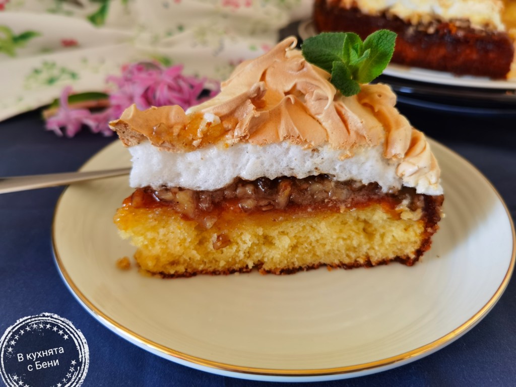 Извадих сладкиша от фурната и топъл го намазах с конфитюра. Поръсих равномерно с накълцаните на дребно орехи и с лъжица разпределих белтъчния крем. С опакото на лъжицата оформих леки завъртулки нагоре. Скарата на фурната вдигнах едно ниво на горе, а температурата намалих на 100 градуса. Върнах сладкиша във фурната и суших глазурата около 1 час, или докато видимо се стегна и доби приятен загар.