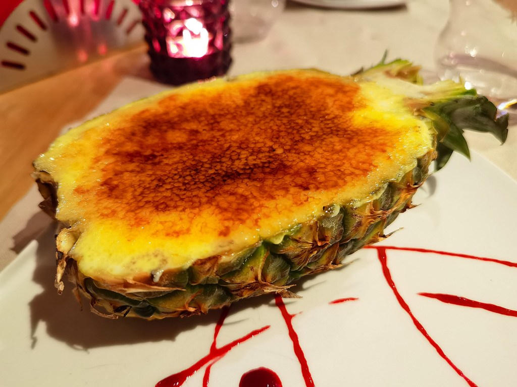 За десерт се насладих на „Брюле с ананас и тръстикова захар, гратинирано в ананас.“ Още когато видях как е презентирано, останах силно впечатлена. За вкусът няма какво да допълня-фантастичен. 🍍🥄😋😍Опитахме и няколко вида сладоледи, приготвени в ресторанта, с различни екзотични плодове и ванилия. 🍨🥄☺️