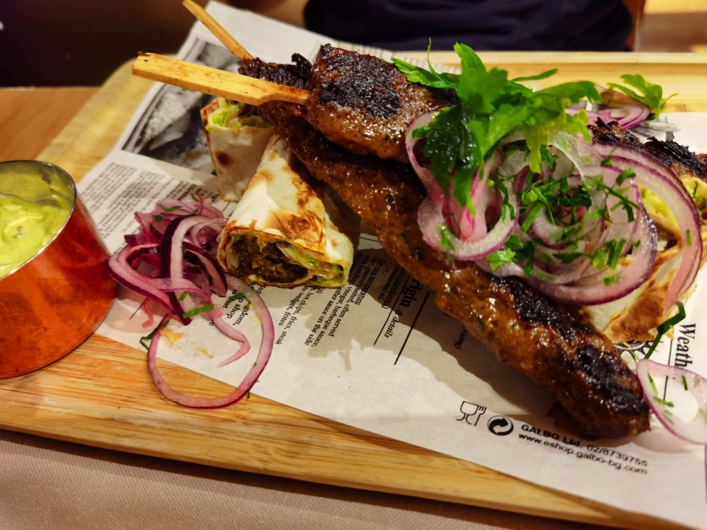 Опитахме „Адана кебап от агнешко и телешко, поднесен върху фалафел – дюнер с релиш от краставици, конфитюр от домати и кисело мляко с къри и мента.“. Кебапът бе отлично изпечен, но и крехък, и сочен. Дюнерите с фалафел бяха много мекички и в отлична комбинация със свежия сос с мента.😋🌮🍢