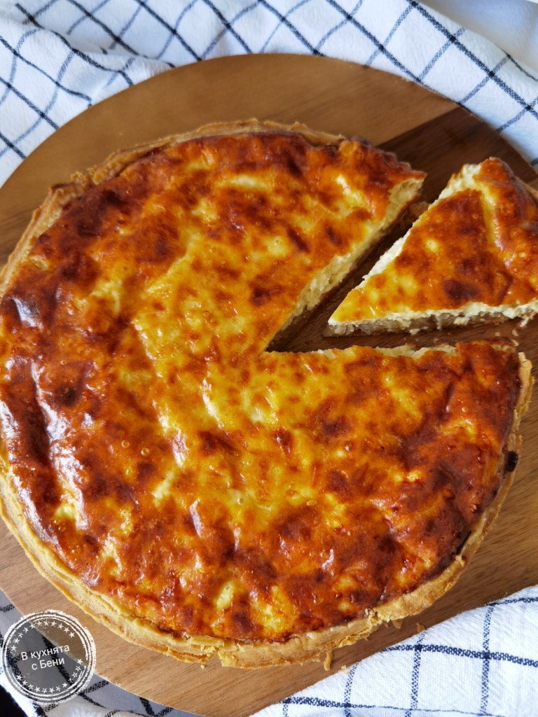 Извадих го и на дъното разпределих лука, след което залях с яйчено-млечната смес. Върнах във фурната, едно ниво по-високо, за да се допече до апетитен загар. Това отне около 25 минути. Леко охладих и отрязах първото парче. Сервирах с айрян.