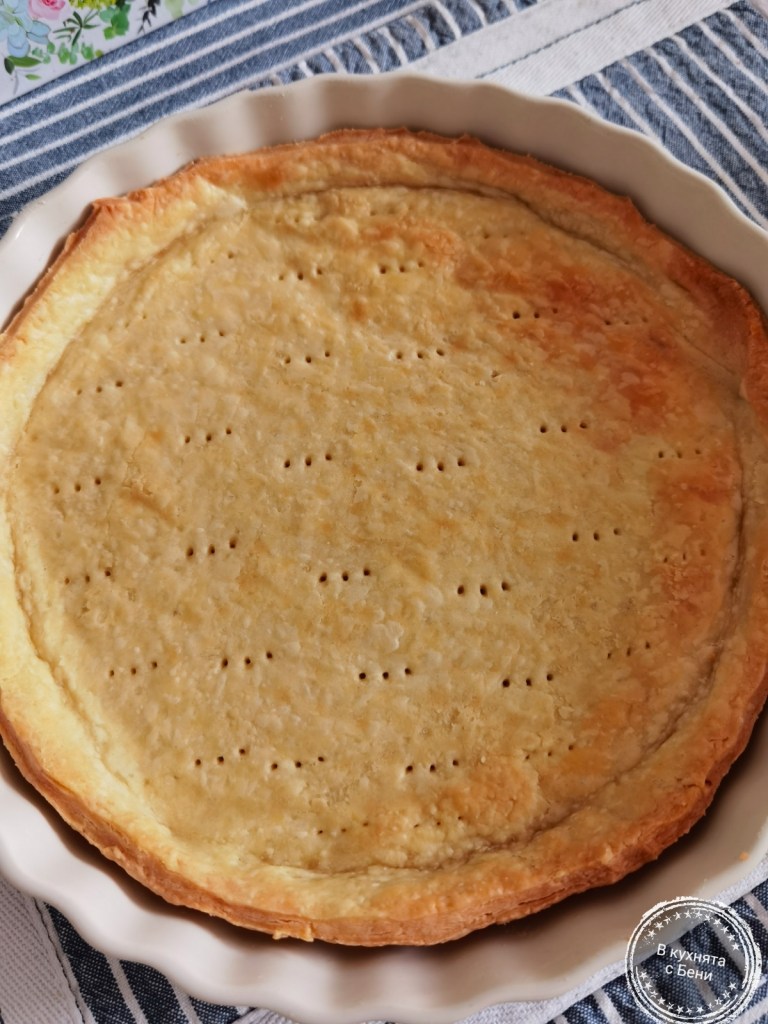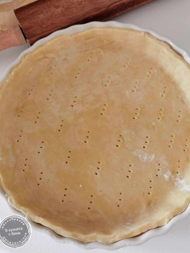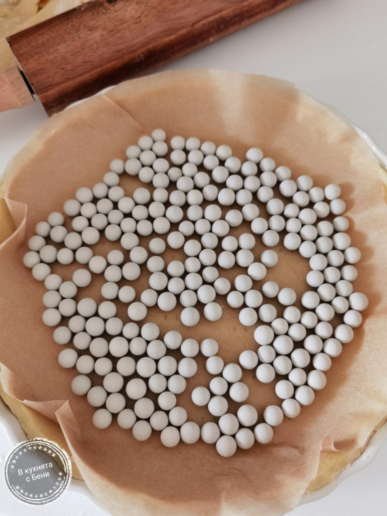 Тестото извадих от хладилника и на леко набрашнен плот го разточих с диаметър отговарящ на формата. Използвах форма за тарт с диаметър 25 см. и височина 4 см. Разбира се трябва да предвидим и още малко тесто, които да вдигнем по краищата. Тестото разположих във формата и леко притиснах. С остър нож изрязах излишното тесто. С вилица набодох дъното и го покрих с хартия за печене, върху която разпределих тежести за печене на пай. Може да ги замените със суров зрял боб. Сложих блата да се пече в добре загрята на 190 градуса фурна за 25 мин., или до видима готовност.