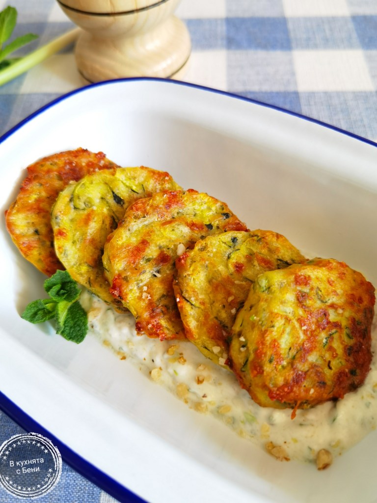 Тиквичките измих добре и без да ги беля, настъргах на средна степен на рендето. Посолих ги и сложих в ситен гевгир тип голяма цедка, а него върху купа, в която да попада отцедената течност. След 30 минути притиснах тиквичките, за да пуснат евентуалната останала течност и ги прехвърлих в купа. Към тях добавих кашкавалът и ситно нарязания магданоз. Киселото мляко смесих със содата и когато шупна, добавих яйцето и разбърках. Тази смес добавих в купата, посолих и прибавих брашното. Разбърках сместа. Фурната загрях на 180 градуса, а голяма тава покрих с хартия за печене, която леко намазах с олио. С лъжица взех от сместа и оформих купчинки, като оставих разстояние по между им. Сложих кюфтенцата от тиквички да се пекат за около 30 минути, като към края на печенето ги обърнах веднъж. Може и да пропуснете този момент. Сервирах ги със сос от 1 ч.ч. цедено кисело мляко, 1 пресована скилидка чесън, шепа ситно нарязани орехови ядки, ситно нарязани листа мента и магданоз, щипка сол и 3 ч.л. зехтин.
