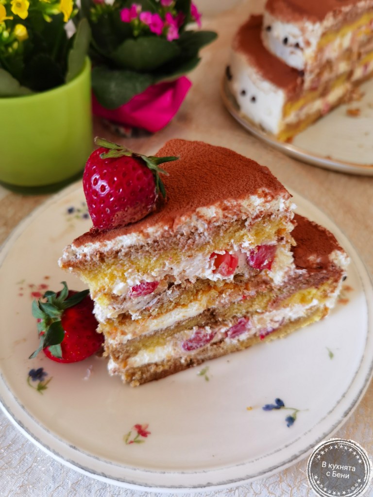 На дъното на чиния за торта сложих един от големите блатове с разрязаната част нагоре. Сиропирах леко с хладкото кафе и нанесох от крема. Отгоре разпределих отцедени ягодови парченца и сложих втория голям блат, с изпечената страна нагоре. Сиропирах го леко и покрих с пласт крем. Върху него разположих един от по-малките блатове, който също леко сиропирах, намазах с крем и разпределих останалите ягоди. Завърших с втория малък блат, който леко сиропирах и намазах с крем. С останалия крем измазах тортата и я прибрах за през нощта в хладилника. На сутрина поръсих с натуралното какао и украсих с няколко ягоди.