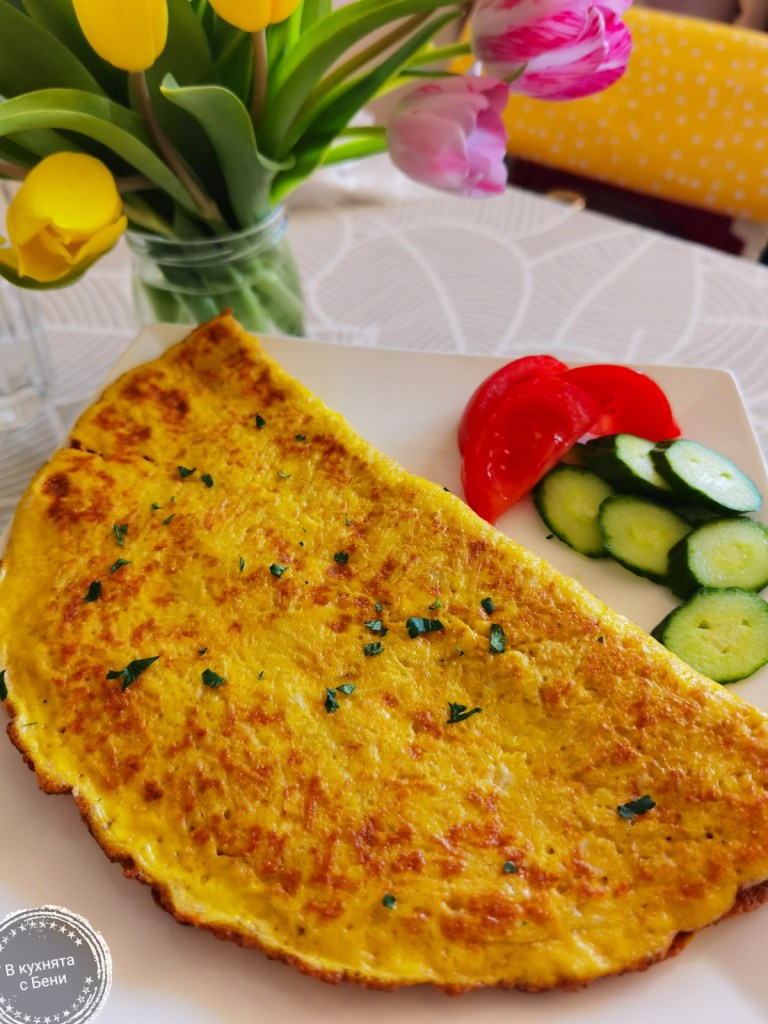 Готвих около 12 минути, или докато се стегна и отдолу доби апетитен загар. С шпатула и ловко движение обърнах омлета. В единия му край разпределих натрошеното на дребно сирене и прехлупих. Готвих така още 3 минути, след което внимателно го обърнах от другата страна за още 2-3 минути. Готовия омлет разположих в чиния и сервирах с парченца свежи краставичка и домат.