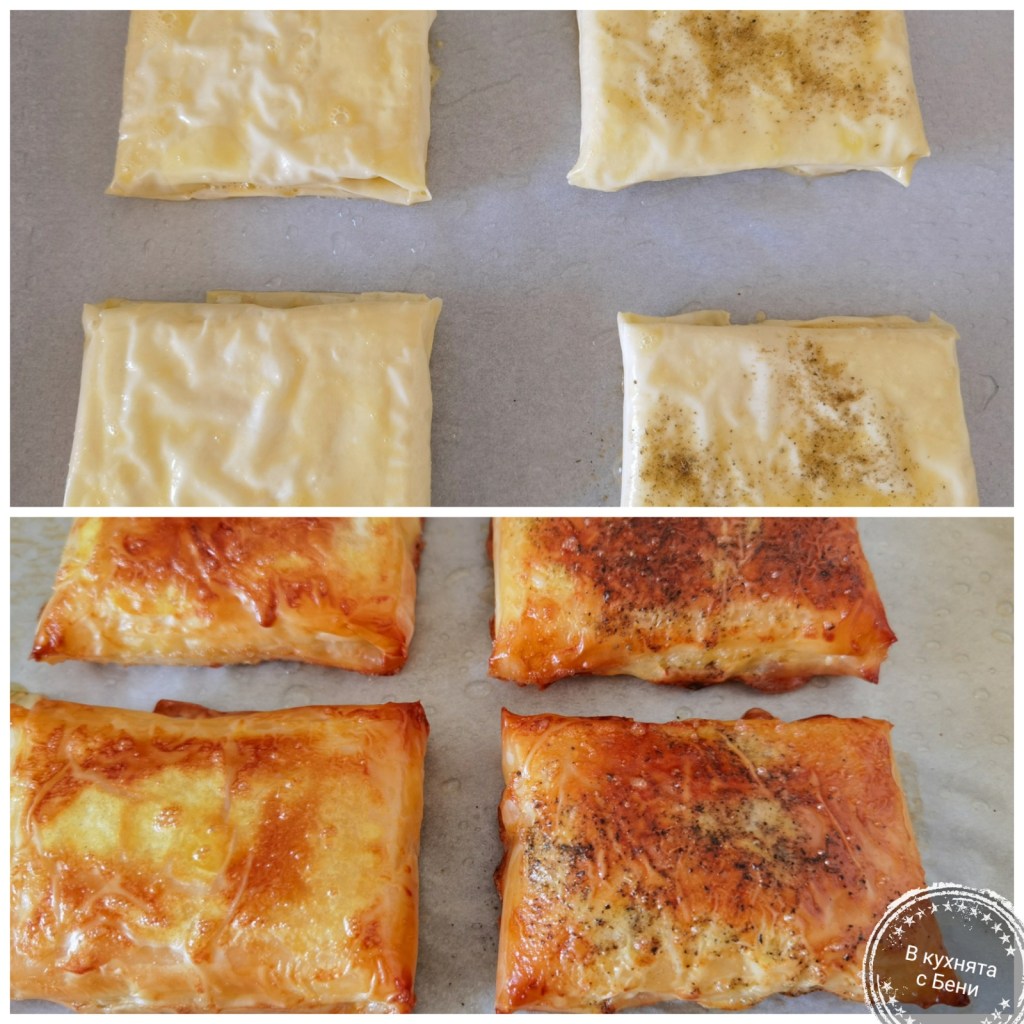 Яйцето разбърках добре и в него потопих всяко опаковано парче от двете страни. Подредих парчетата в тавата, като две от тях поръсих с шарена сол, тъй като малкият ми син я обича. Сложих ги да се пекат за около 15 минути, или до видима готовност.