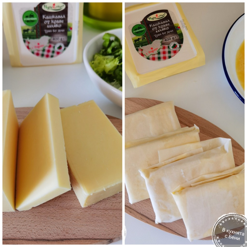 Кашкавала разрязах на четири равни части. Фурната загрях на 190 градуса и тавата покрих с хартия за печене, която леко намазах с олио.