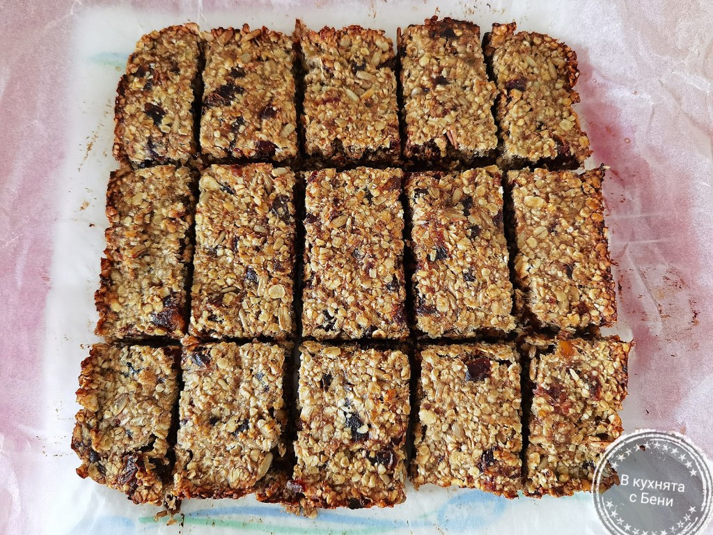 Малка форма с размер 20х20х5 см. покрих с хартия за печене, която леко намазах с масло. Изсипах сместа и я разпределих равномерно, притискайки. Сложих десерта да се пече в загрята на 170 градуса фурна за 25 минути, или по видима готовност и приятен загар. Оставих да се охлади за 10 минути, след което още топъл, но не горещ, с остър нож го разрязах на парченца. Оставих ги да изстинат и поднесох с няколко ивици от любимия ми сироп от фурми.