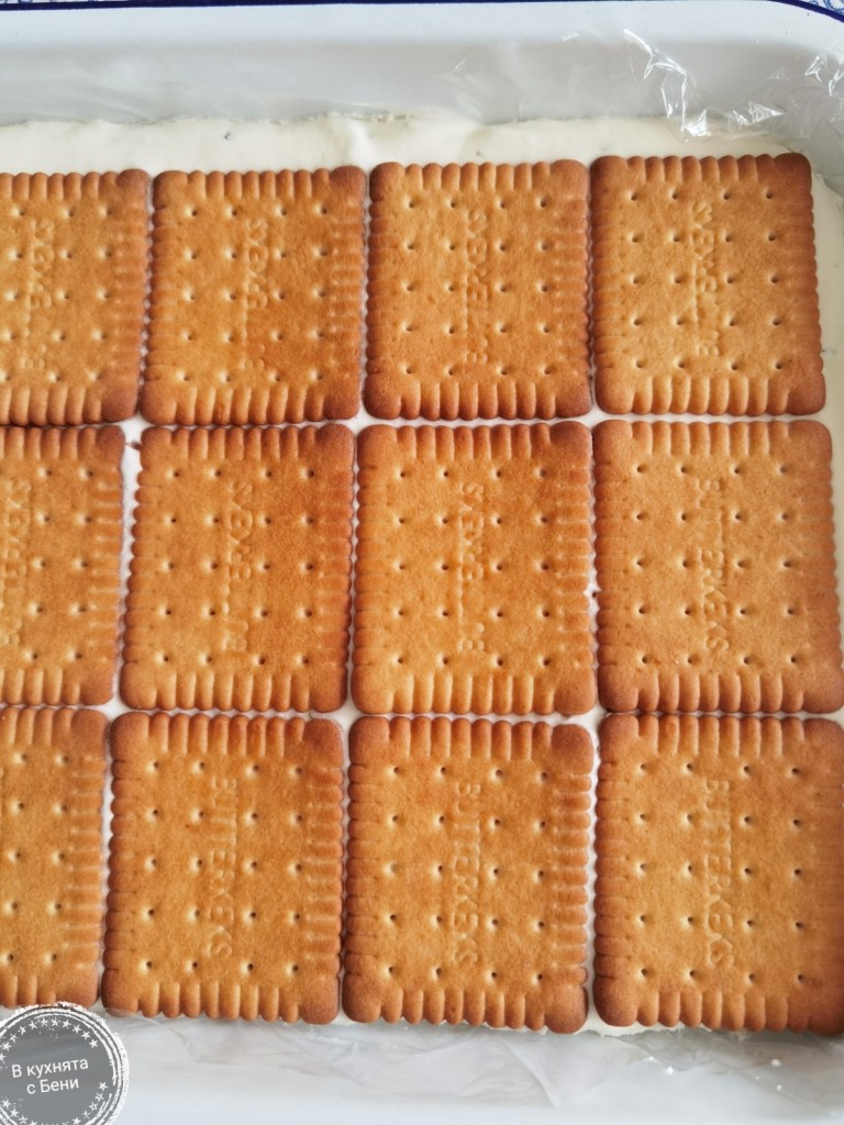 Дъното и стените на тавичка с размер 28х22 см. покрих с голямо парче фолио за свежо съхранение. Отрязах по-голямо парче, което да излиза от тавата и да може лесно да се извадят след стягането сладоледените сандвичи. Взех бисквита, която потопих за секунда в студеното мляко и подредих на дъното на тавата. По този начин процедирах и с останалите. Върху образувалия се блат изсипах сладоледената смес и я разпределих равномерно. Отгоре покрих с останалите бисквити, потопени за секунда в мляко, като се старах да са на нивото на тези от долния ред и така да се отреже сладоледен сандвич с добра форма.
