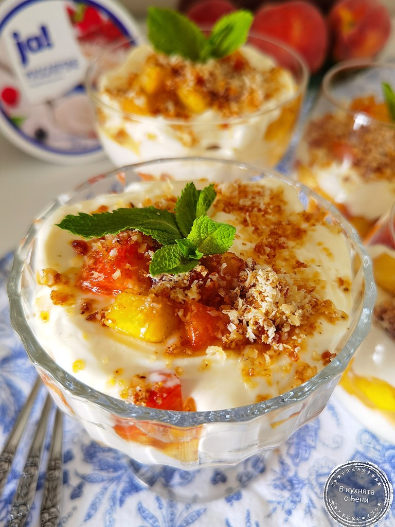 В неделя ще поглезя семейството си с много свеж и вкусен крем с праскови и орехов крокан. 🍨🥄🍑😋 За направата му използвах любимото ми маскарпоне JA, което винаги е с чудесен вкус. 👩🍳💯 Ползвала съм и на други марки, но това ми остава фаворит. За десерта са нужни и добре узрели праскови, които за радост са в сезона си. 🍑☺️🛒