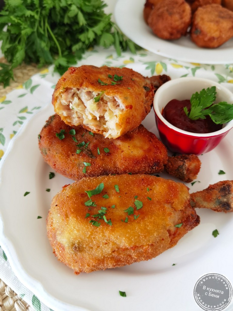 Взех първото бутче и го сложих в добре загрятата мазнина. Пържих до златист загар от двете страни или по 5-6 минути на страна. Дори да са добили нужния загар, ги готвих още малко, за да съм сигурна, че са готови. Не трябва да го докосваме в първите минути на готвенето. Пърженето всъщност е важен момент за успеха на рецептата. Ако степента на котлона е по-висока, бутчетата бързо ще добият нужния загар, но няма да се сготвят отвътре. За обръщането им използвах кухненска дълга щипка. Пържих по едно бутче, за да мога да контролирам процеса. Готовите изваждах в чиния, покрита с домакинска хартия. По този начин приготвих и другите. Тъй като ми остана малко смес, а вече нямах кокалчета, я оформих на малки топчета, които панирах и изпържих по същия начин.