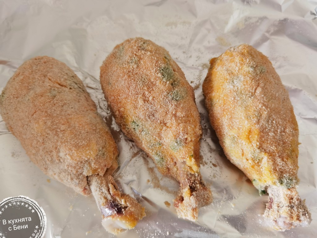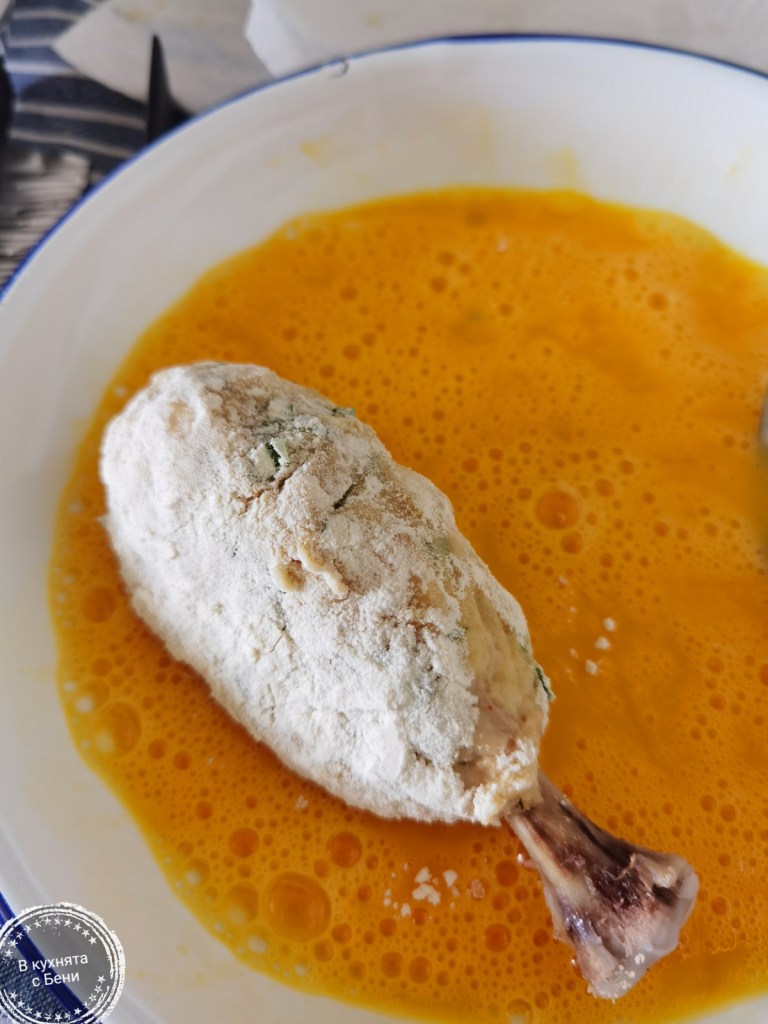 Откъснах две парчета алуминиево фолио. Върху едното сложих разделени брашното и галетата, другото предвидих за вече оформените бутчета. В подходящ съд разбърках двете яйца с щипка сол. В дланите си сложих 2 лъжици от сместа и в средата разположих кокалчето. С ръце оформих бутче, което овалях в брашно. Така процедирах и с останалите. След това ги потопих в яйцата и овалях в галетата. На моменти имах колебания дали кокалчета ще издържат тежестта на сместа, но всичко беше наред.