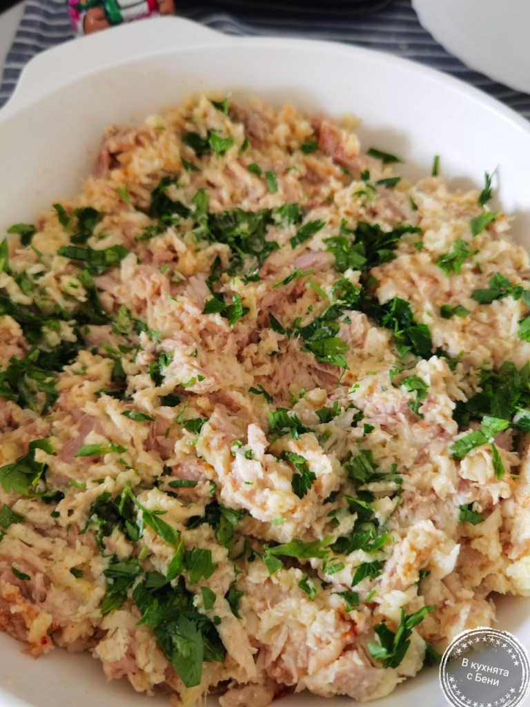 Готовите бутчета извадих в чиния, за да изстинат леко и с ръце ги обезкостих, като запазих кокалчетата им. И тях почистих добре. Месото нарязах на ситно и сложих при намачканите картофи. Посолих леко и поръсих с белия и червения пипер. Добавих брашното, настъргания на едро кашкавал, пармезан и ситно нарязаната листна част на магданоза. С ръце омесих сместа.