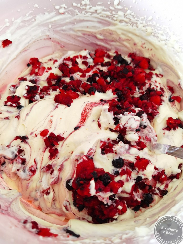 Замразените плодове облях с топла вода, за да се отпуснат леко и ги сложих в кухненския робот, за да ги нарежат на дребно. Може да направите това и на ръка. Добавих ги в купата с крема и разбърках с шпатула, до смесването им.
