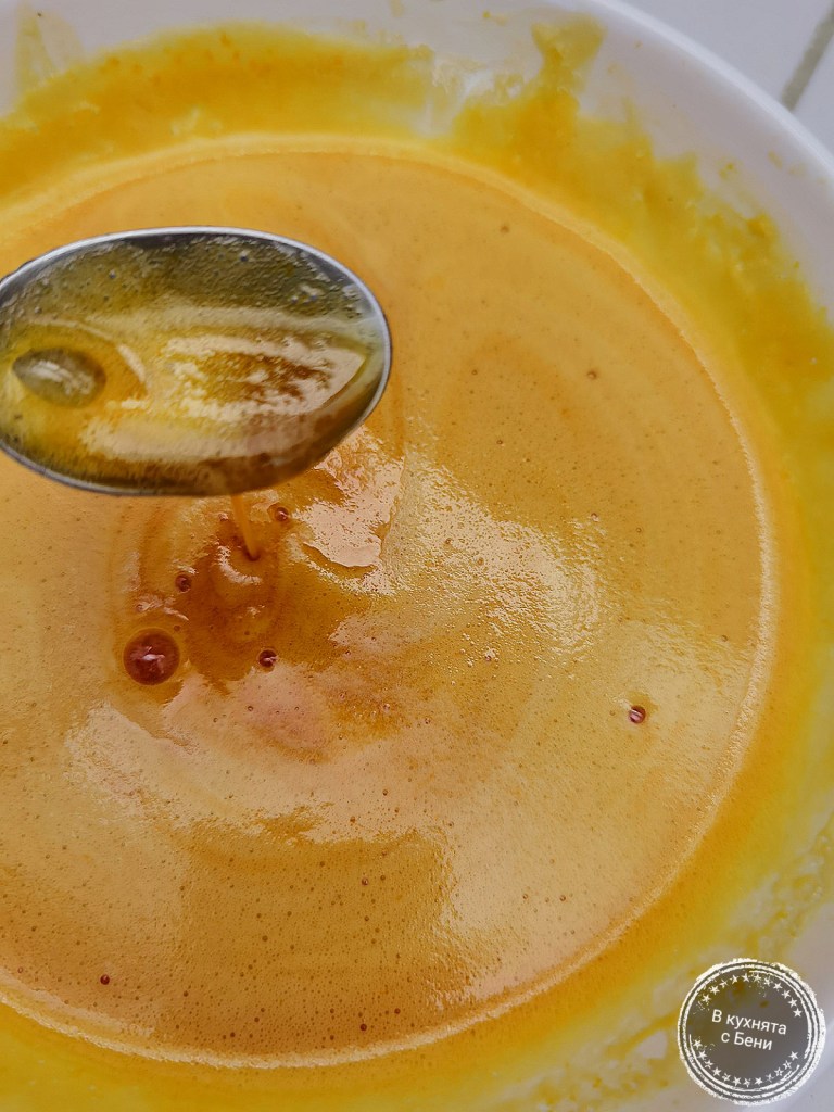 В съд на водна баня сложих двете цели яйца, двата жълтъка и захарта. Разбърквах и готвих около 12 минути, или докато сместа започне леко да се сгъстява. След като това се случи, я оставих да се охлади напълно.