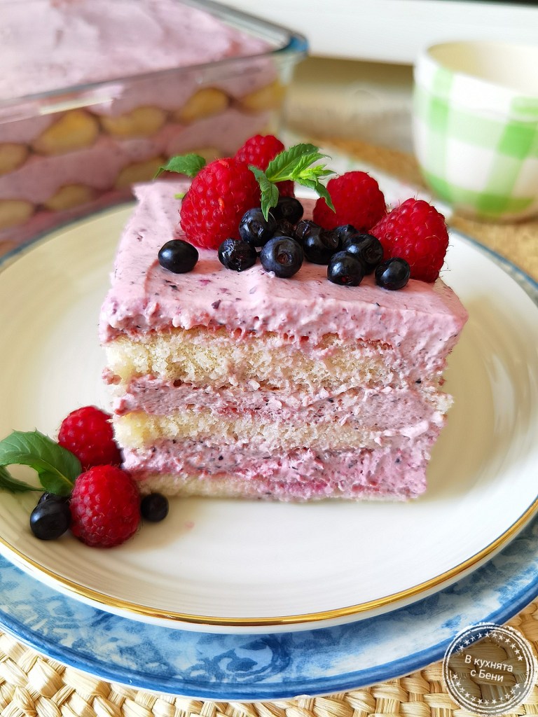 Сервирах украсен с малини, боровинки и мента.