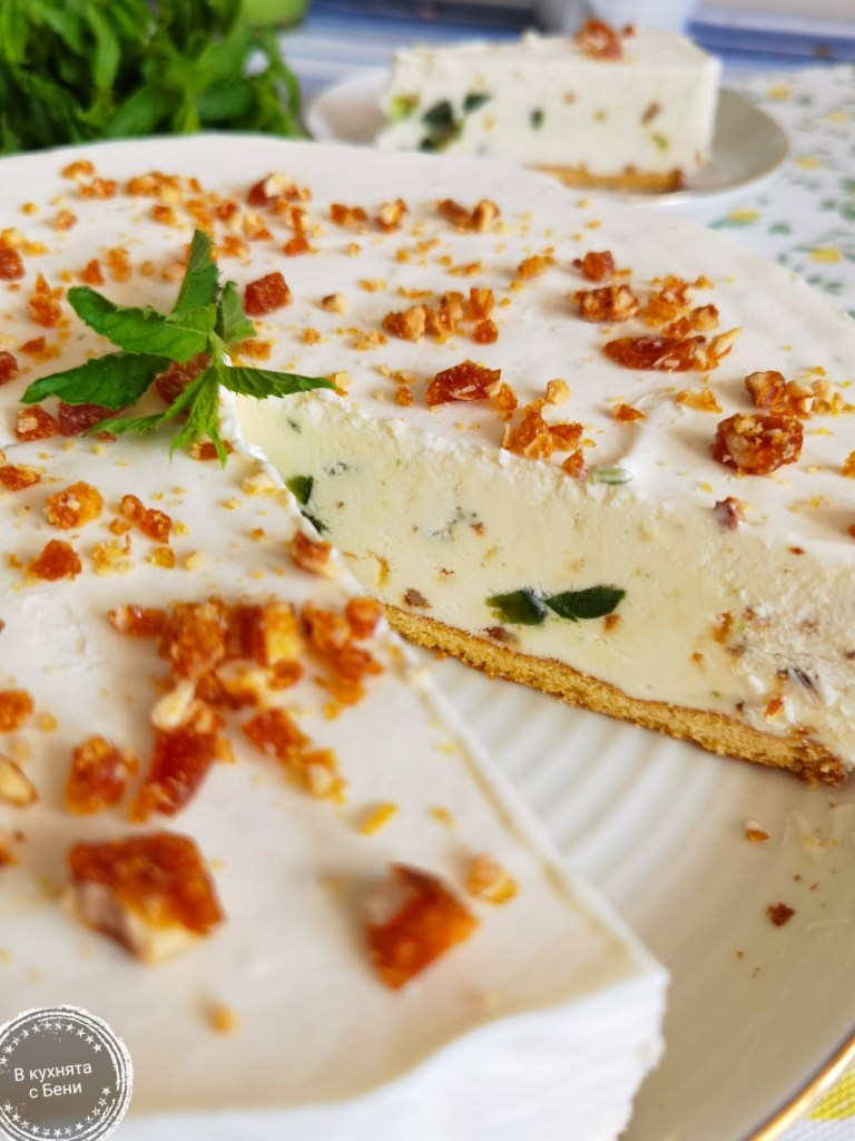 Преди сервиране, махнах ринга и хартията. С остър и затоплен нож отрязах първото парче. Декорирах с още малко крокан и листчета свежа мента.
